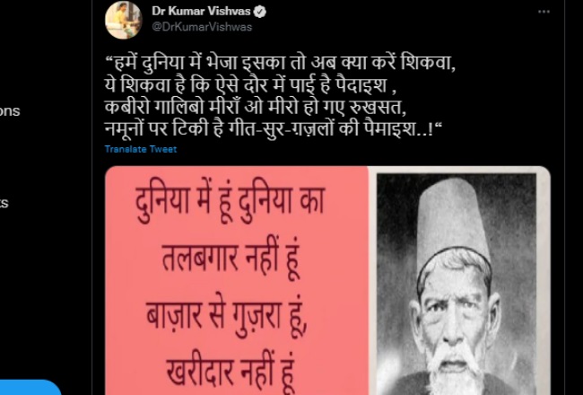 बता दें कि अपनी शायरी और कविताओं के लिए देश-दुनिया मेें मशहूर कुमार विश्वास अपने चुटीजे अंदाज के लिए भी जाने जाते हैं। वह अपने अलग ही अंदाज में देश-दुनिया में हो रही घटनाओं पर टिप्पणी करते हैं। खासकर राजनीतिक मसलों पर उनकी टिप्पणी को लोग खूब पसंद करते हैं और इन पर इंटरनेट मीडिया पर प्रतिक्रिया भी देतेे हैं।