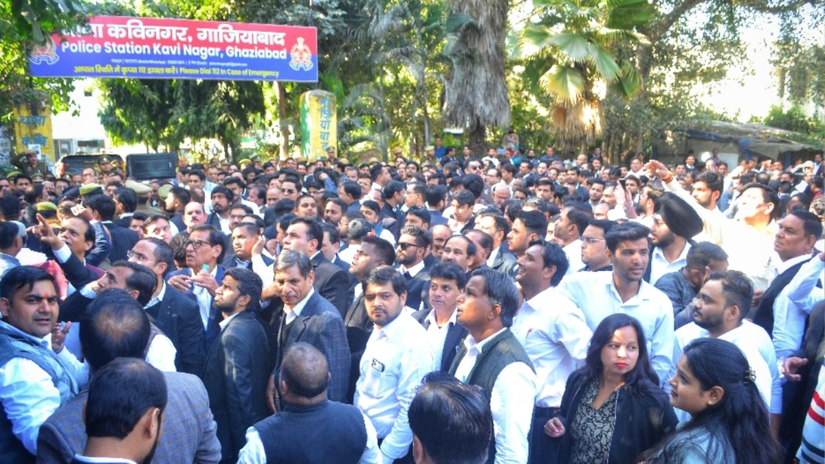 दोपहर करीब साढ़े 12 बजे वकील एकत्र होकर पैदल हापुड़ रोड होते हुए कविनगर थाने पहुंचे। पुलिस ने थाने के बाहर ही वकीलों को रोक दिया। थाने पर भी बड़ी संख्या में पुलिसकर्मी तैनात किए गए थे। थाने के अंदर नहीं जाने देने पर वकील सड़क पर ही बैठ गए। वकीलों ने जिला जज के खिलाफ नारेबाजी करते हुए अपनी गिरफ्तारी की मांग की। एसीपी कविनगर अभिषेक श्रीवास्तव ने वकीलों को जांच जारी रहने तक कोई अग्रिम कार्रवाई नहीं किए जाने की जानकारी दी