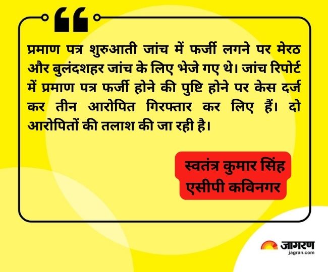 एसीपी कविनगर स्वतंत्र कुमार सिंह ने बताया कि प्रमाण पत्र शुरुआती जांच में फर्जी लगने पर मेरठ और बुलंदशहर जांच के लिए भेजे गए थे। जांच रिपोर्ट में प्रमाण पत्र फर्जी होने की पुष्टि होने पर केस दर्ज कर तीन आरोपित गिरफ्तार कर लिए हैं। दो आरोपितों की तलाश की जा रही है।