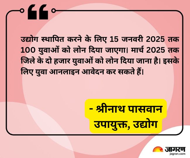 इस संबंध में उद्योग उपायुक्त श्रीनाथ पासवान ने बताया कि उद्योग स्थापित करने के लिए 15 जनवरी 2025 तक 100 युवाओं को लोन दिया जाएगा। मार्च 2025 तक जिले के दो हजार युवाओं को लोन दिया जाना है। इसके लिए युवा ऑनलाइन आवेदन कर सकते हैं।