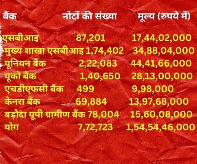 | बैंक | नोटों की संख्या | मूल्य (रुपये में) |
