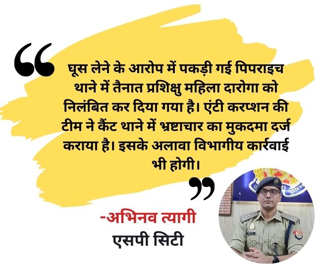 महिला दारोगा के साथ पिकेट के पास खड़े सिपाहियों को जैसे ही इसका आभास हुआ, वह भाग निकले। एंटी करप्शन की टीम ने महिला दारोगा के विरुद्ध कैंट थाने में भ्रष्टाचार का मुकदमा दर्ज कराया है।