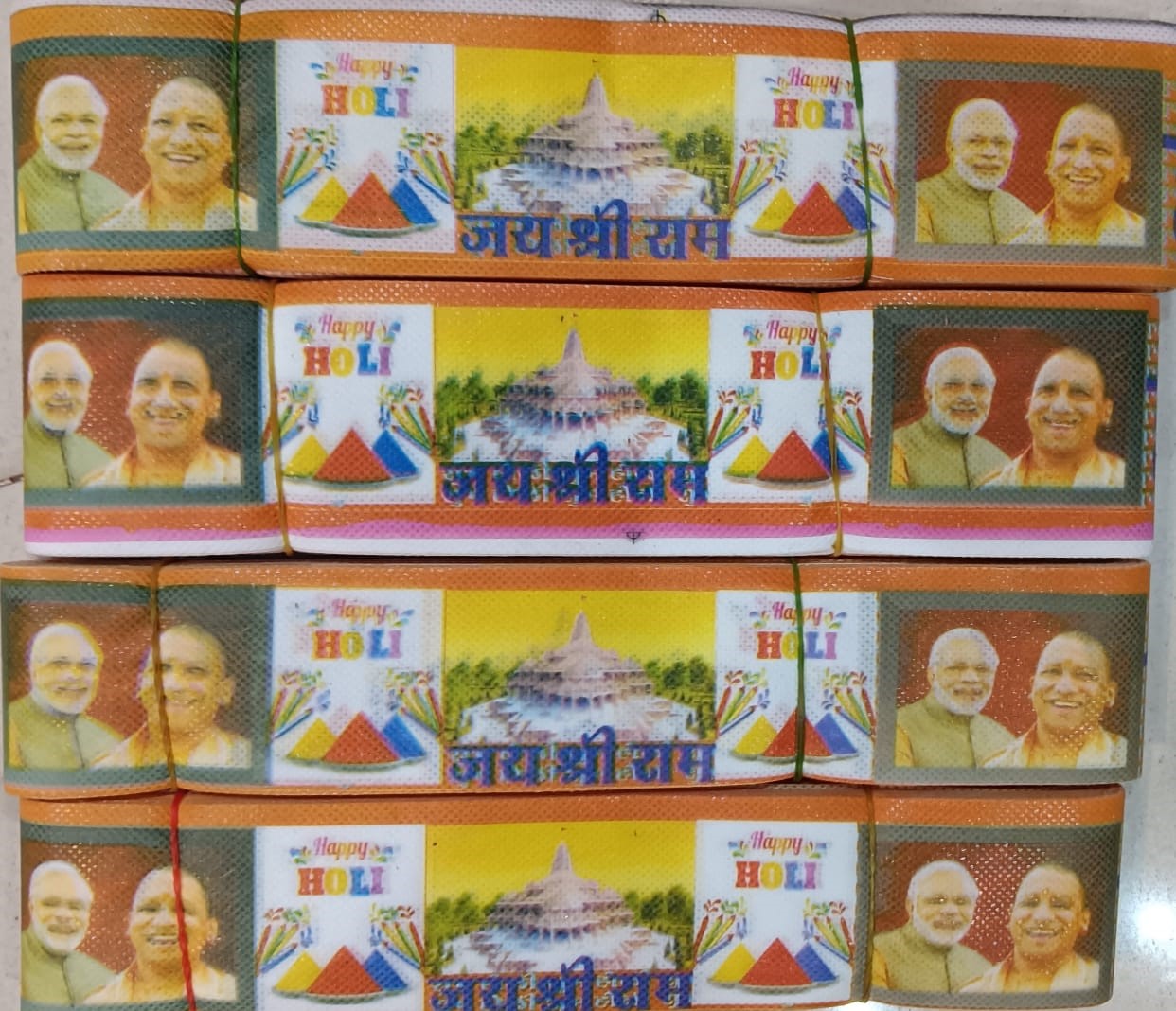 इसकी कीमत एक हजार व 12 सौ रुपये हैं। योगी-मोदी का सिर में बांधने वाली पट्टी खासकर युवा अधिक पसंद कर रहे हैं। इसमें बीच में अयोध्या का श्रीराम मंदिर का चित्र आकर्षण का केंद्र है और यह प्रति पीस दस रुपये में उपलब्ध है। ये सभी माल दिल्ली मंगाए गए हैं।