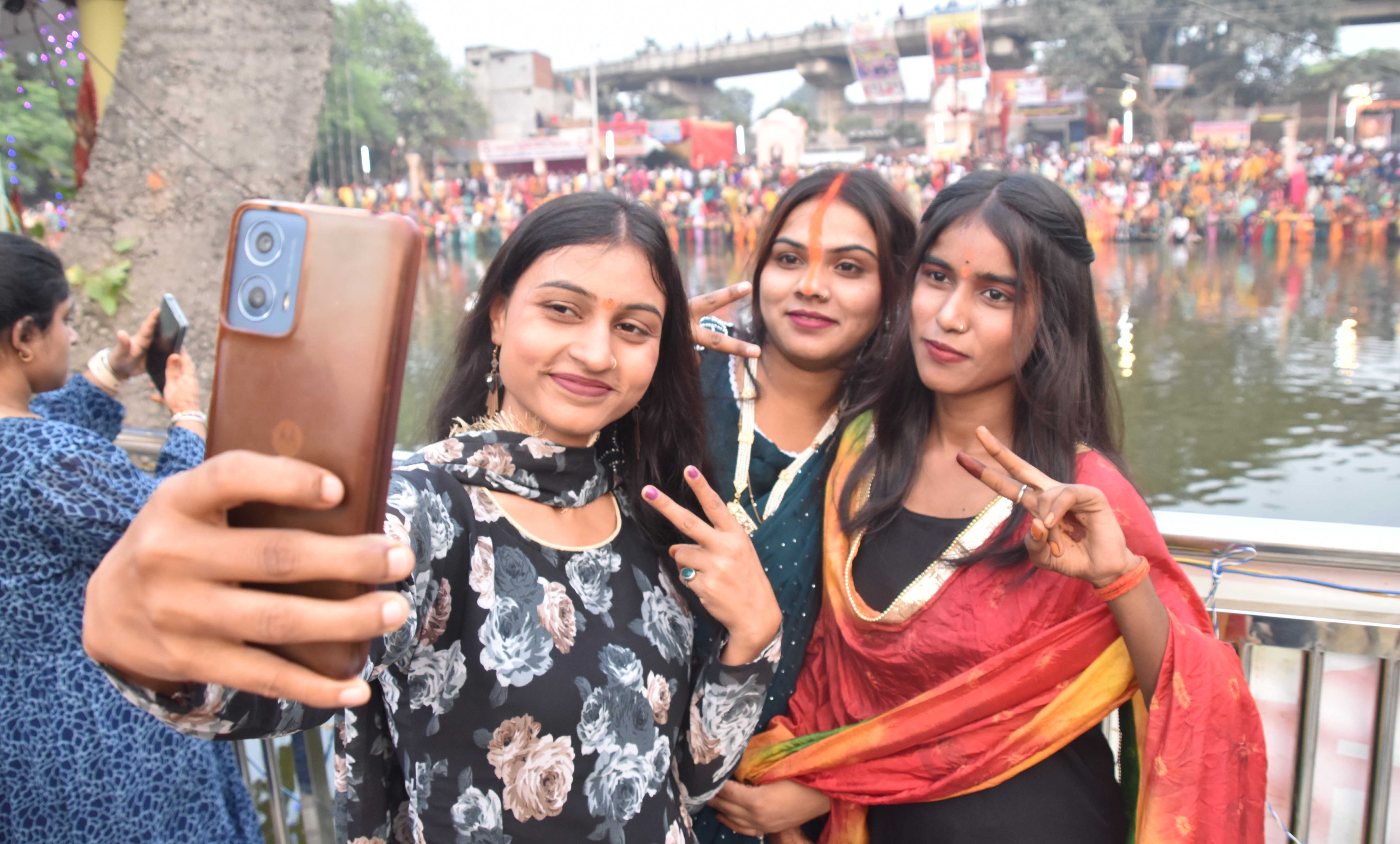छठ पर्व के अवसर पर सूर्यकुंड धाम स्थित पोखरे पर पूजन अर्चन के दौरान सेल्फी लेतीं श्रद्धालु। संगम दूबे