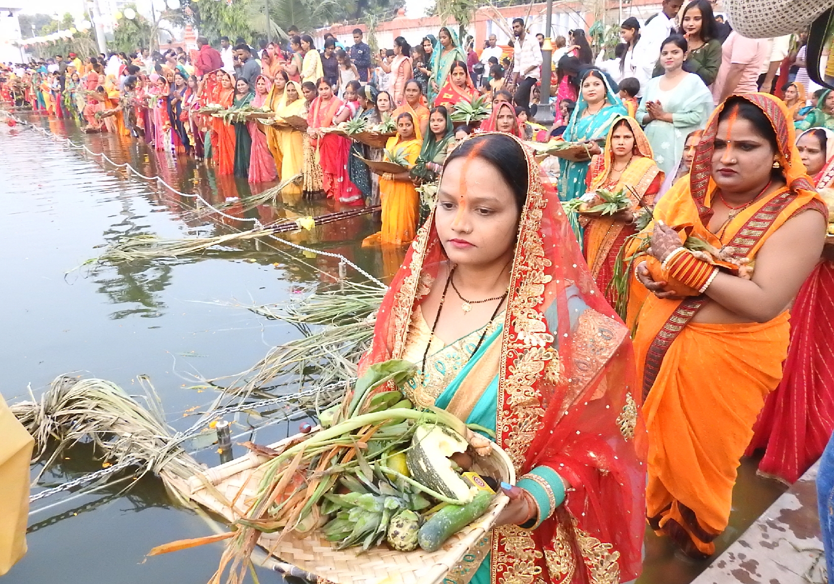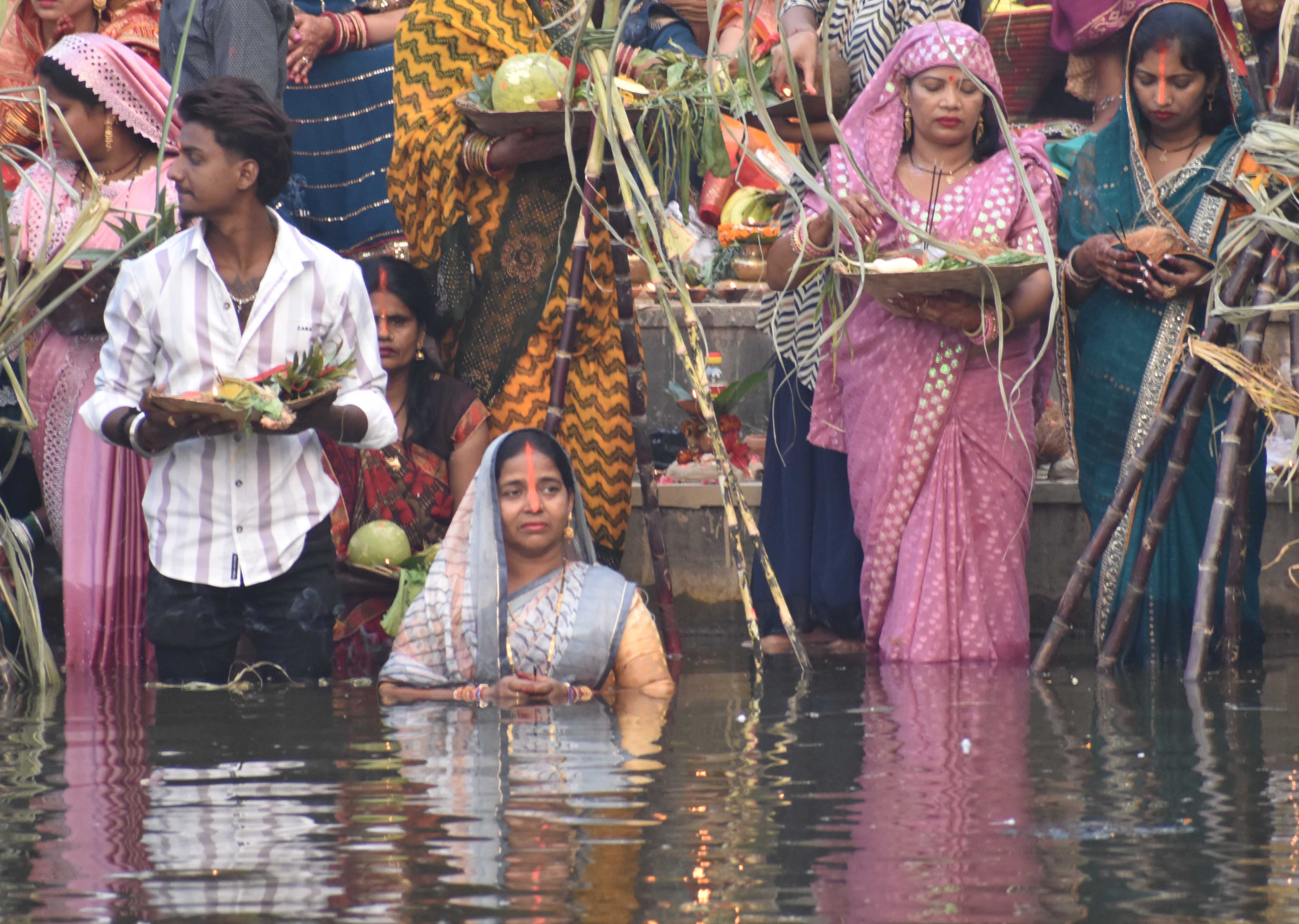 घाट पर आकर हर भेद-विभेद मानों सरोवर में डूब जाता है और भक्ति भाव भीड़ को एक रंग में रंग देता है। अस्ताचलगामी को अर्घ्य देने की प्रतीक्षा में व्रती माताएं सरोवर में खड़ी हैं। भीड़ में कुछ पुरुष भी भुवन भास्कर की ओर मुंह कर हाथ जोड़े खड़े हैं। जिन्हें पानी में जगह नहीं मिली, उन्होंने सीढ़ियों पर जगह ले ली है।
