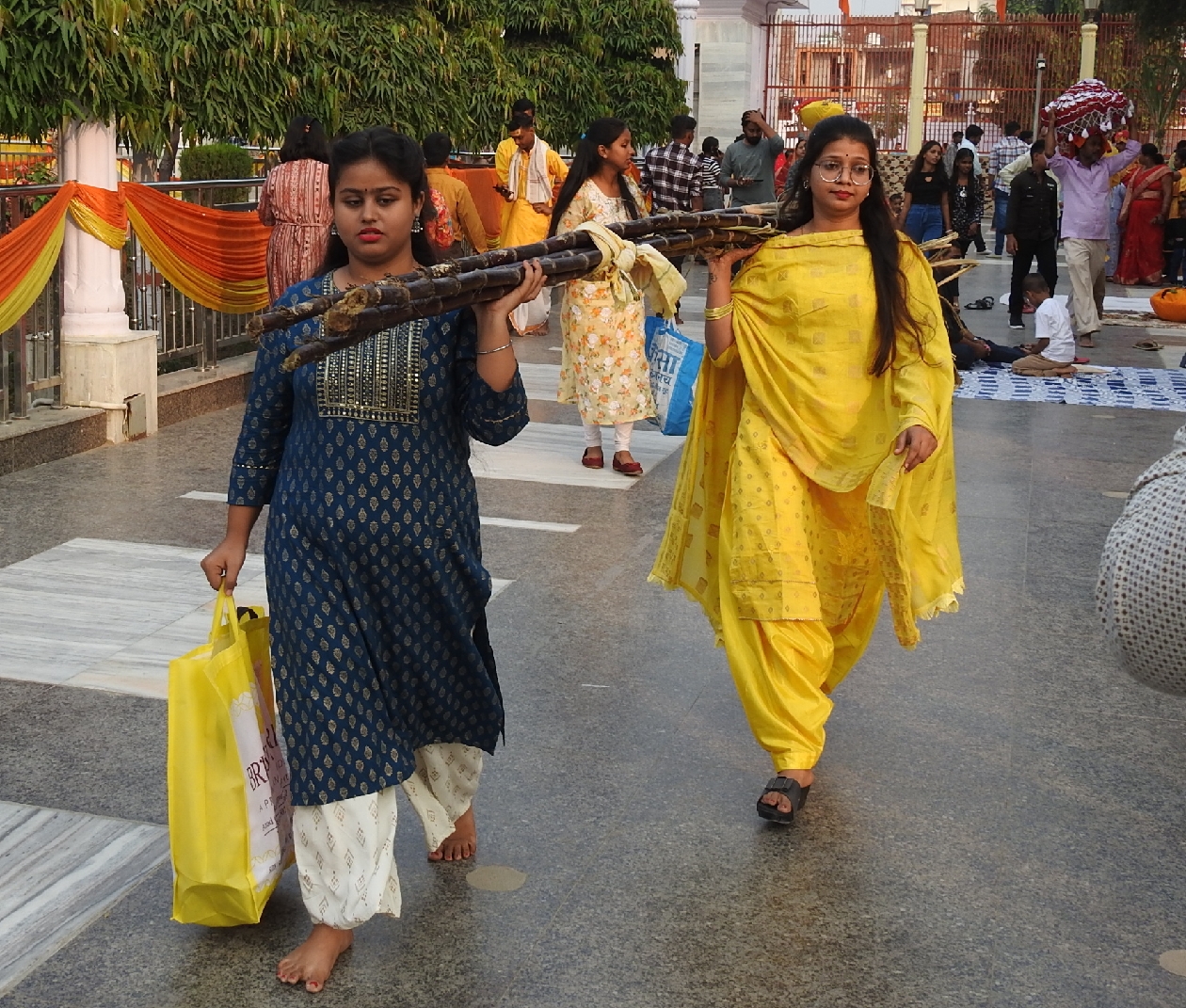 गोरखनाथ मंदिर परिसर में स्थित भीम सरोवर पर छठ पूजा के लिए गन्ना लेकर जाती युवतीयां।-पंकज श्रीवास्तव