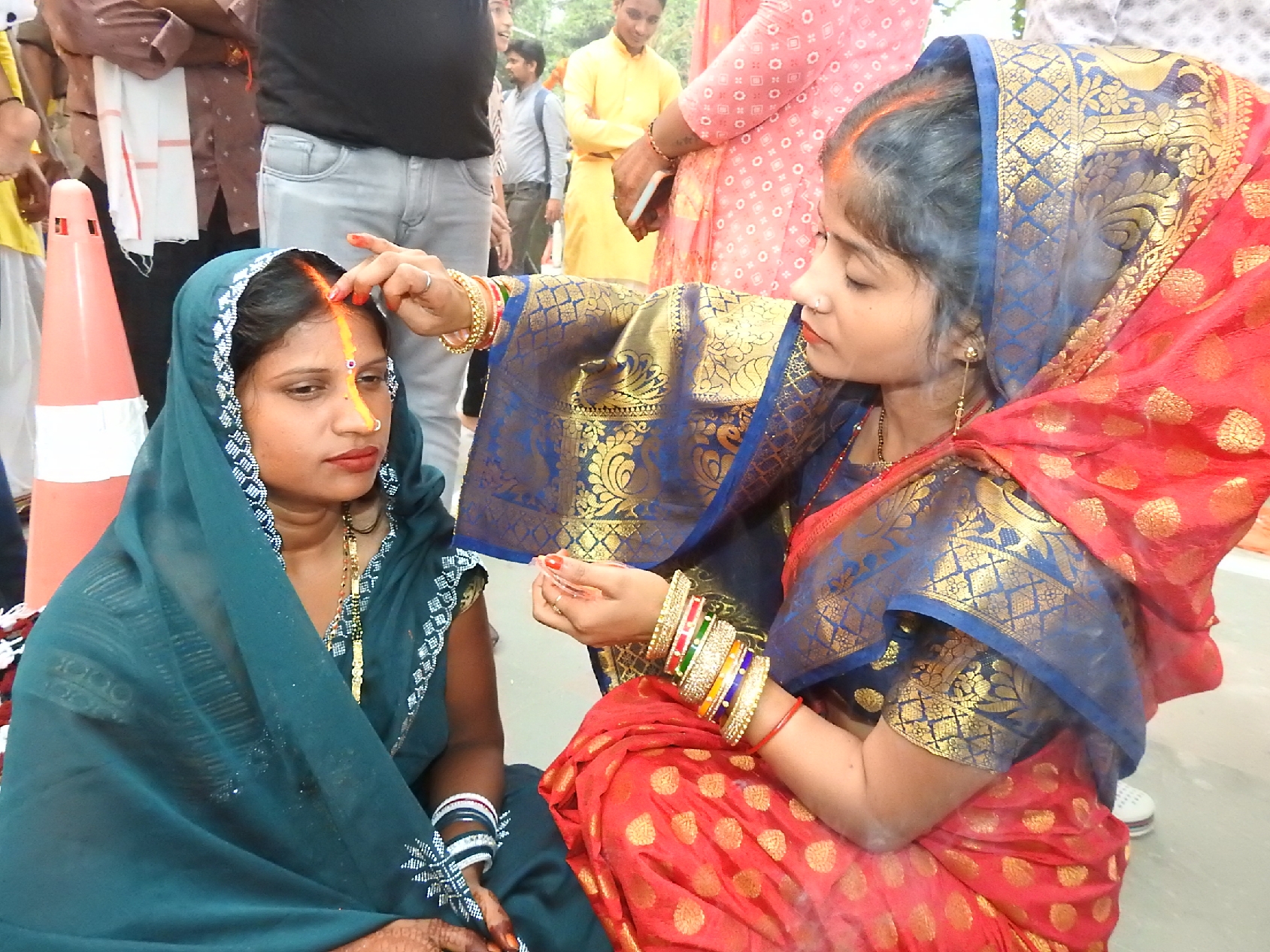 गोरखनाथ मंदिर परिसर में स्थित भीम सरोवर पर छठ पूजा के दौरान एक दुसरे को सिन्दूर लगाती महिलाएं।-जागरण