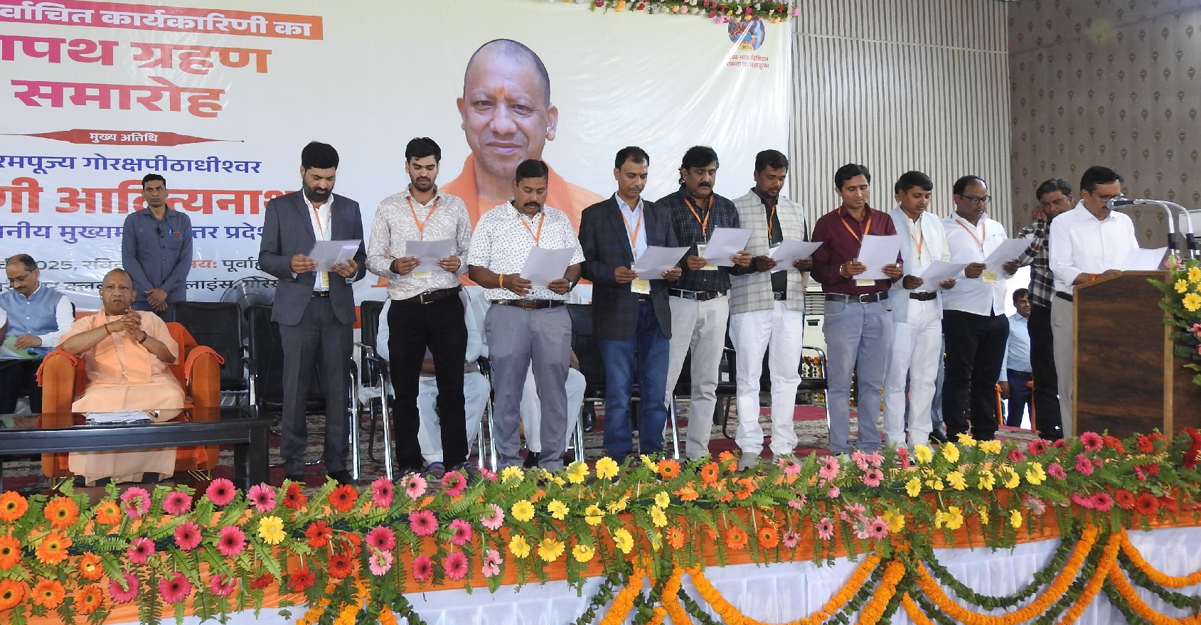 गोरखपुर क्लब में गोरखपुर जर्नलिस्ट्स प्रेस क्लब के नवनिर्वाचित कार्यकारिणी के शपथ ग्रहण समारोह नई कार्यकारिणी के सदस्यों को शपथ दिलाते महापौर डा मंगलेश श्रीवास्तव तथा शपथ ग्रहण समारोह में उपस्थित मुख्यमंत्री योगी आदित्यनाथ। जागरण