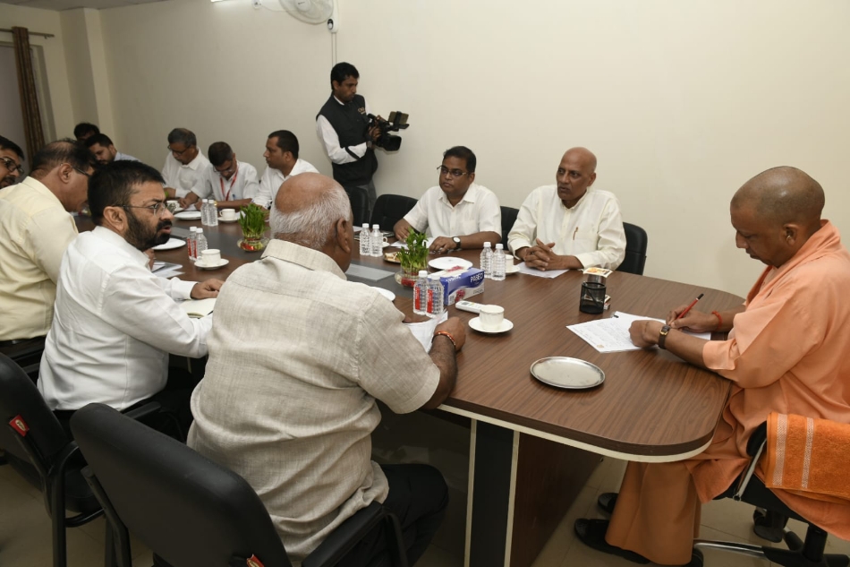 भटहट में स्थित आयुष विश्वविद्यालय का निरीक्षण करने के जनप्रतिनिधियों व अधिकारियों के साथ बैठक करते मुख्यमंत्री योगी आदित्यनाथ। सौ, सूचना विभाग