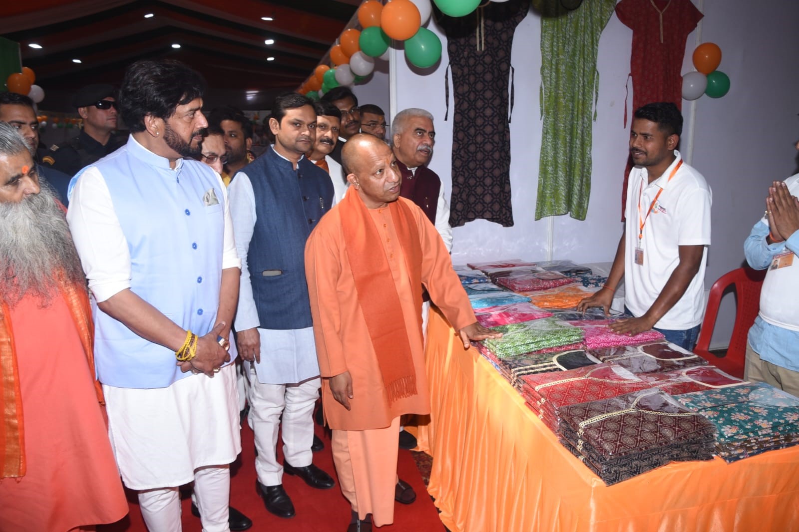 मुख्यमंत्री युवा उद्यमी विकास अभियान के अन्तर्गत गोरखपुर,बस्ती मंडल के संयुक्त क्रेडिट कैम्प के शुभारंभ कार्यक्रम में लगायें गये स्टालो का अवलोकन करते मुख्यमंत्री योगी आदित्यनाथ,साथ में मंत्री सूक्ष्म लघु, एवं मध्यम उद्यम खादी एवं ग्रामोद्योग मंत्री राकेश सचान,सांसद रवि किशन अन्य। सौ. सूचना विभाग