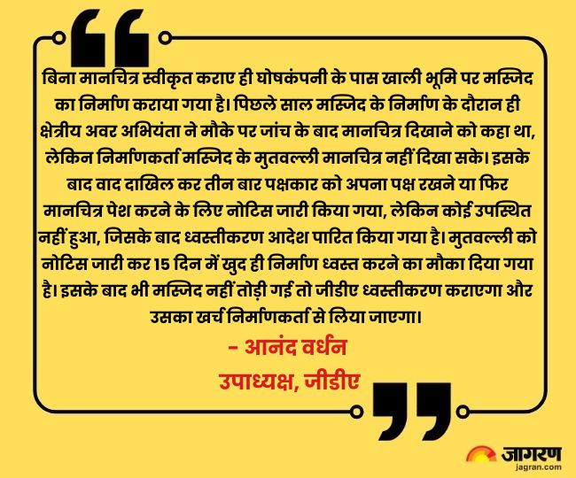 घोषकंपनी स्थित मेवातीपुर में पिछले साल ही बनी तीन मंजिला मस्जिद की इमारत तोड़ने के लिए पारित ध्वस्तीकरण आदेश और नोटिस की जानकारी प्राधिकरण ने ई-मेल के जरिये जिलाधिकारी कृष्णा करूणेश को भी दी है।