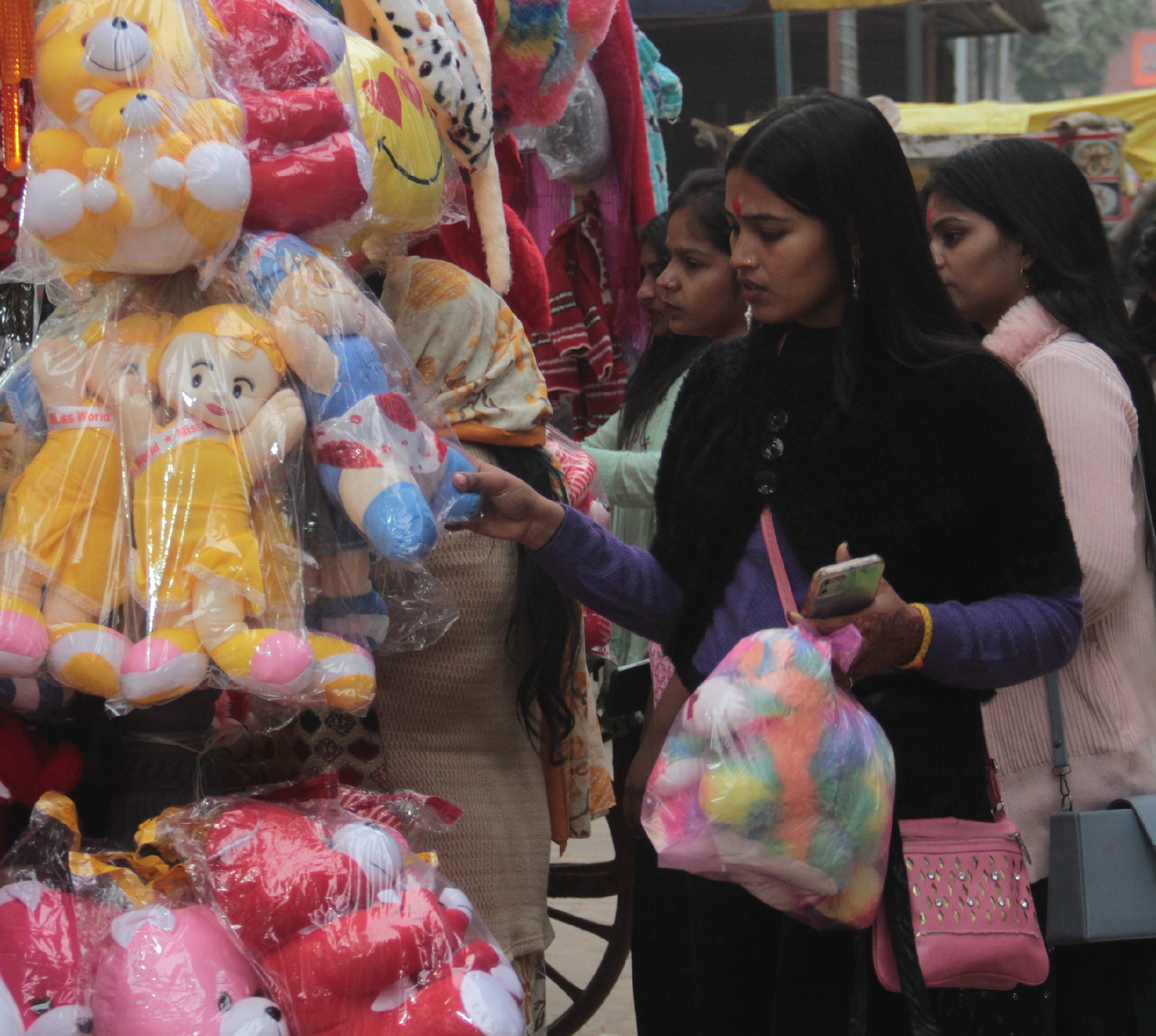 खिचड़ी मेला परिसर में टेडीबियर की खरीदारी करती युवती। जागरण