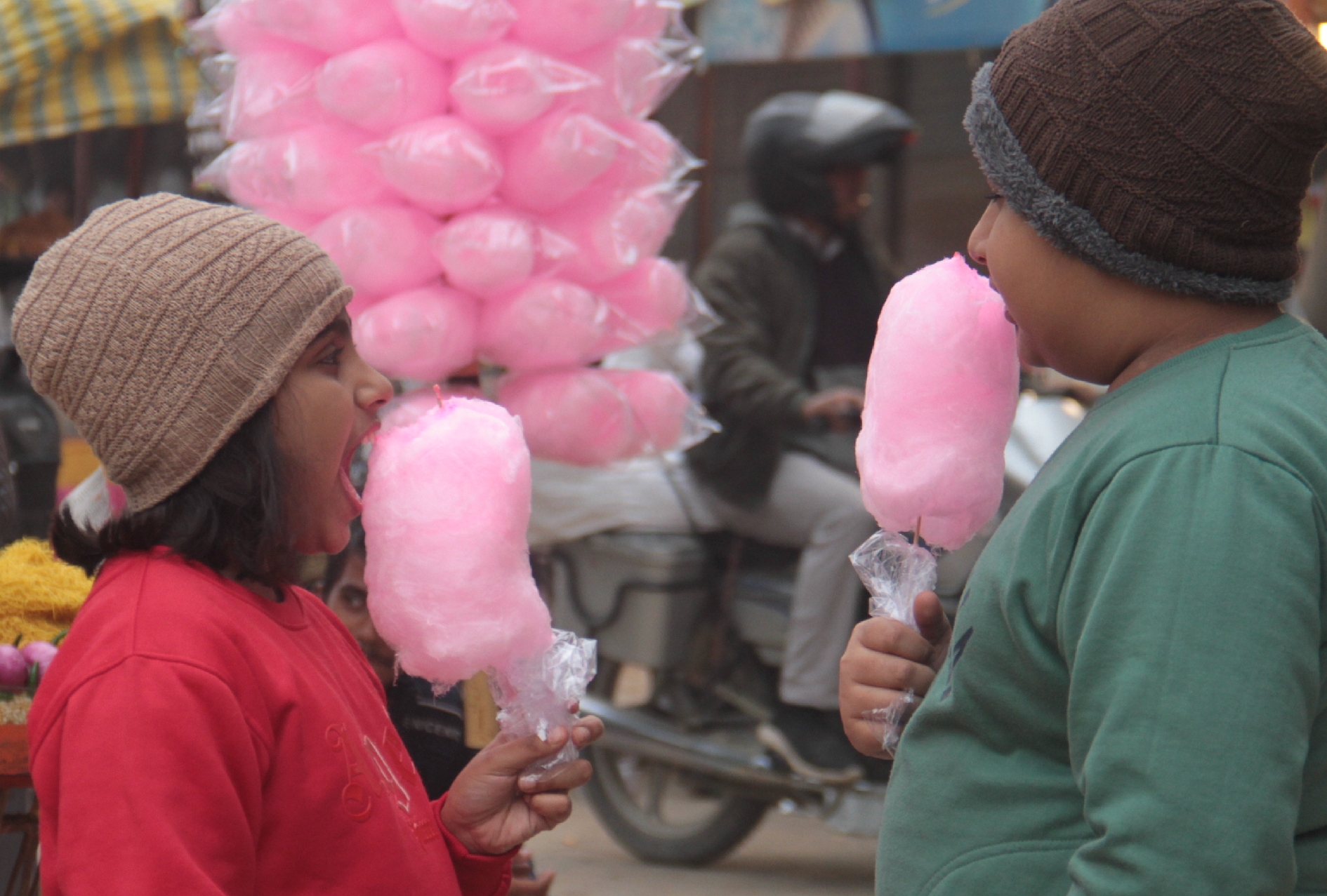 खिचड़ी मेला परिसर में काटन कैंडी का आनंद लेते बच्चे। जागरण