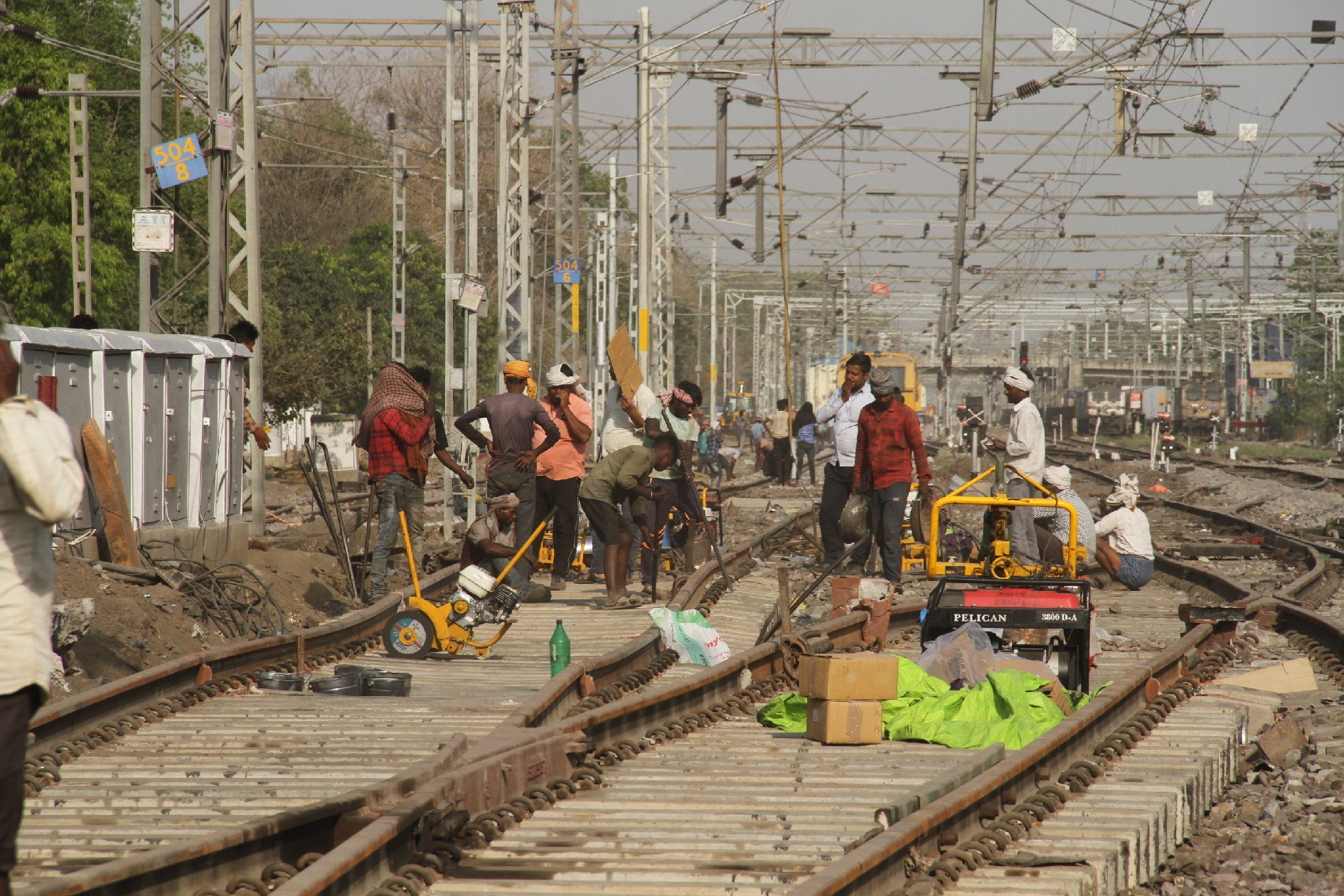 रेलवे ट्रैक रिमाडलिंग में जुटे कामगार। जागरण