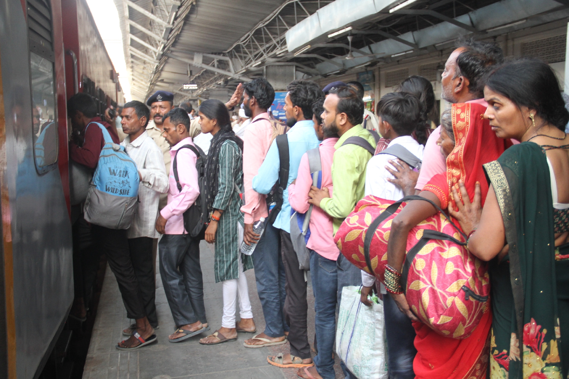 शुक्रवार को दिल्ली की ओर जाने वाली गोरखधाम में यात्रियों की भीड़ अधिक रही। साधारण कोच में बैठाने के लिए आरपीएफ के जवानों ने कड़ी मेहनत की। ट्रेन में जगह पाने के लिए कतार में खड़े यात्री। -अभिनव राजन चतुर्वेदी