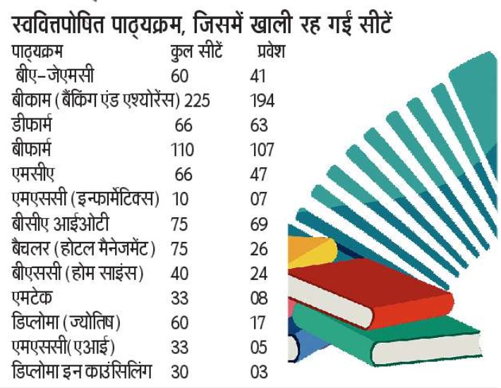 वर्तमान सत्र से शुरू हुए एमएससी एआइ पाठ्यक्रम में 33 सीटों के सापेक्ष केवल पांच अभ्यर्थियों ने प्रवेश लिया है। बैचलर आफ होटल मैनेजमेंट की दो तिहारी सीटें खाली रह गई हैं। पीजी डिप्लोमा इन गाइडेंस व काउंसिलिंग के लिए 30 सीटों के सापेक्ष केवल तीन सीटों पर ही प्रवेश हो सका है।