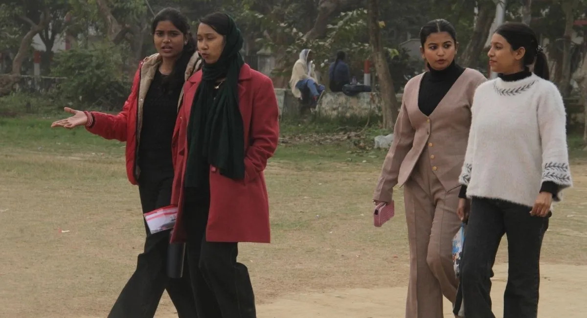 गर्म कपड़ों में कालेज जाती छात्राएं। जागरण