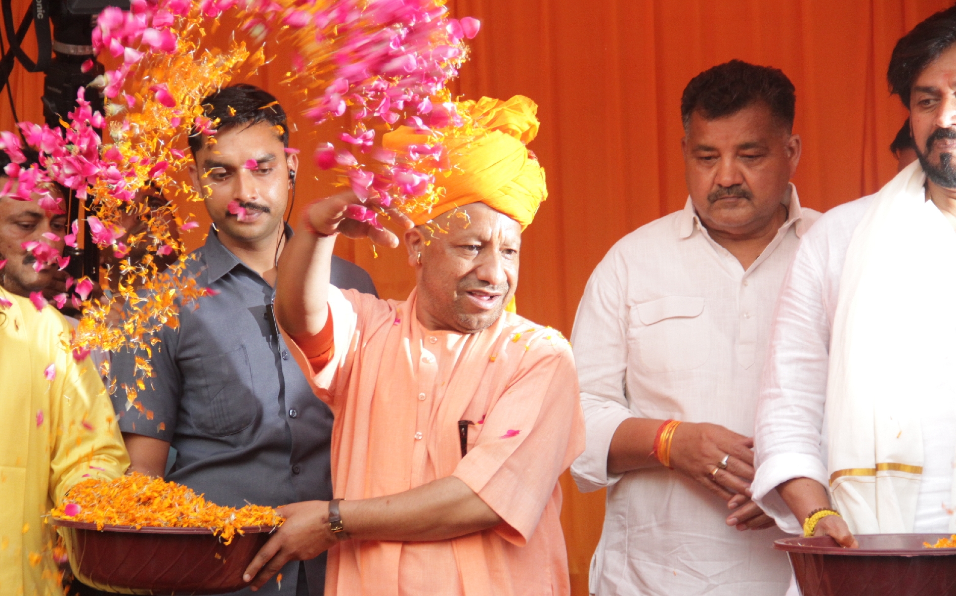 पाण्डेयहाता में होलिका दहन शोभायात्रा के दौरान लोगों पर पुष्प वर्षा करते मुख्यमंत्री योगी आदित्यनाथ। अभिनव राजन चतुर्वेदी