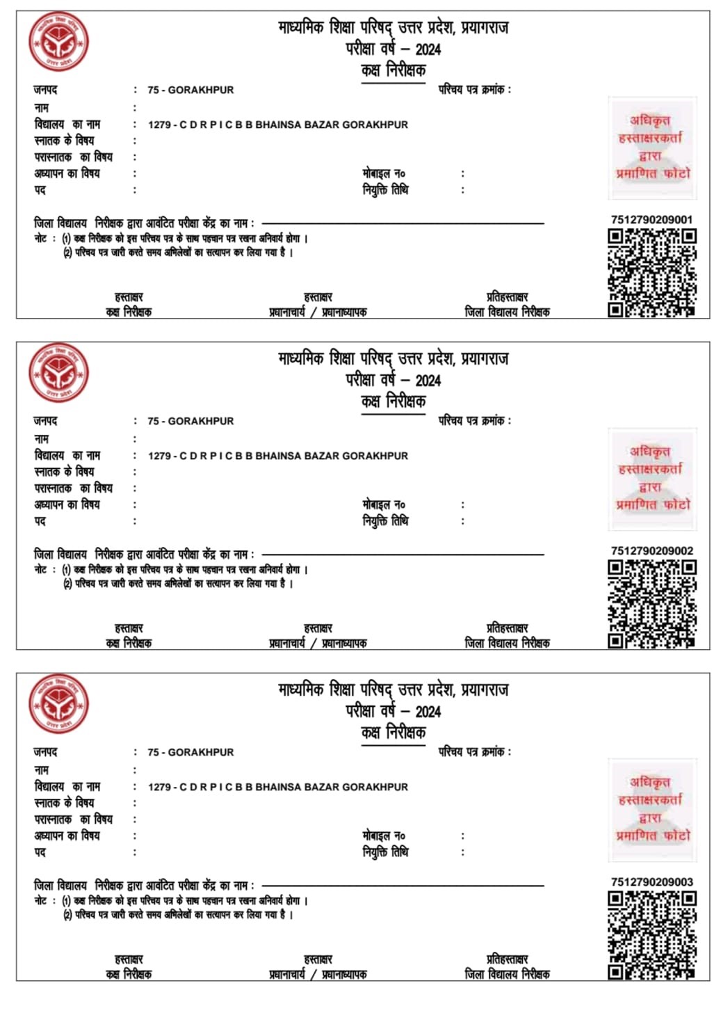 जागरण संवाददाता, गोरखपुर। उत्तर प्रदेश माध्यमिक शिक्षा परिषद (यूपी बोर्ड) ने परीक्षा के दौरान पारदर्शिता बरतने हुए पहली बार कक्ष निरीक्षकों को क्यूआर कोड वाला परिचय पत्र जारी किया है। जिसे स्कैन करते ही संबंधित शिक्षक का फोटो सहित संपूर्ण ब्योरा मसलन नाम, ड्यूटी का नाम, फोटो, विद्यालय का नाम, अध्यापक का विषय, पद व मोबाइल नंबर आदि जानकारी सामने आ जाएगी।