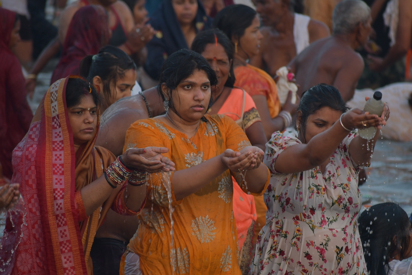 Maha Kumbh 2025 मेला में माघी पूर्णिमा स्नान पर्व पर सूर्य देवता को अर्ध्य देतीं श्रद्धालु महिलाएं।-गिरीश श्रीवास्तव