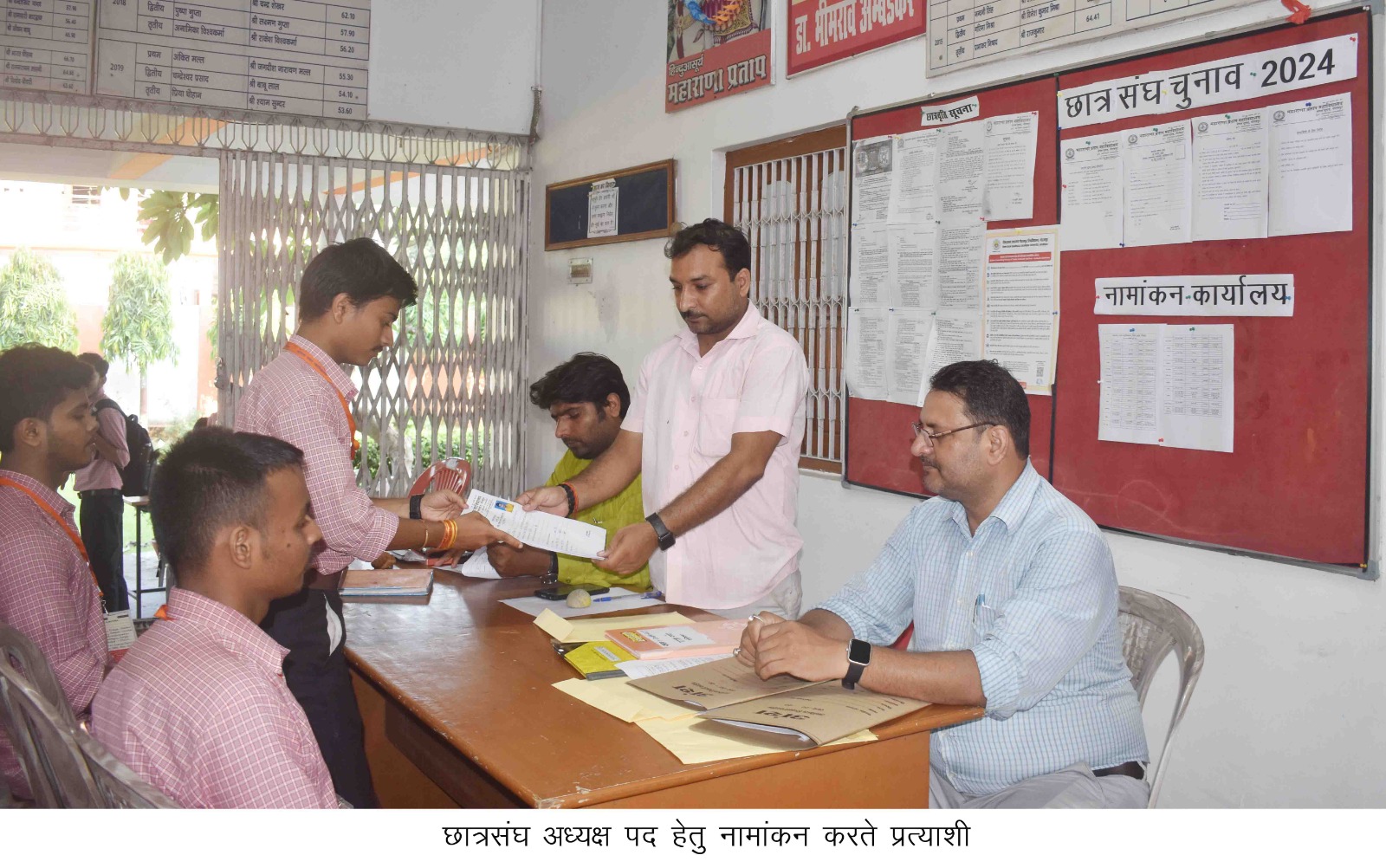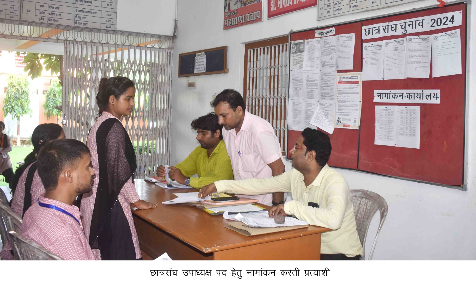 इसके बाद शाम तीन बजे से साढ़े चार बजे तक अध्यक्ष, उपाध्यक्ष, महामंत्री और पुस्तकालय मंत्री के पदों के लिए पर्चा दाखिला हुआ। डा. राव ने बताया कि छात्रसंघ चुनाव में पदाधिकारी का चुनाव लड़ने के लिए कक्षा प्रतिनिधि होना अनिवार्य है।
