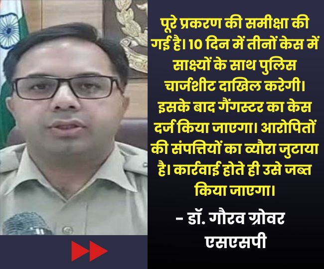 तीनों की समीक्षा करते हुए एसएसपी ने 10 दिन के अंदर चार्जशीट दाखिल करने का निर्देश दिया। साथ ही उनके विरुद्ध गैंग्सटर एक्ट की कार्रवाई करते हुए उनके संपत्ति का व्यौरा जुटाने का निर्देश दिया। एसपी सिटी और सीओ को हर दिन इस मामले की समीक्षा करने को कहा। इसके अलावा सप्ताह में एक दिन वह खुद समीक्षा करेंगे।