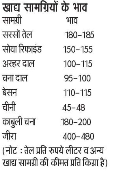 किराना व्यापारी निकुंज टेकड़ीवाल के मुताबिक एक बार फिर पहले की तरह तेल का भाव बढ़ने लगा है, जिससे लोगों की परेशानी बढ़ गई है। सरसों तेल में तेजी का असर ग्राहकों की जेब पर पड़ने लगा है। डेढ़ माह के अंदर सरसों तेल के दाम 25 से 30 रुपये प्रति लीटर तक बढ़ गए हैं। अरहर दाल में नरमी है। जबकि चीनी, आटा, बेसन, चना दाल व जीरा आदि के भाव स्थिर हैं।