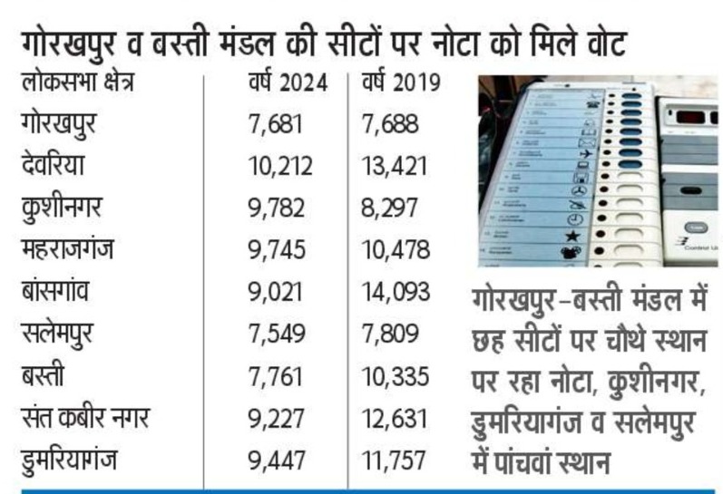 UP Lok Sabha Chunav Result 2024 गोरखपुर-बस्ती मंडल की नौ सीटों में से जहां छह पर नोटा चौथे स्थान पर रहा वहीं कुशीनगर डुमरियागंज व सलेमपुर के मतदाता इसे पांचवें स्थान पर रखने में सफल रहे। सर्वाधिक 10 हजार 212 मतदाताओं ने देवरिया में नोटा पर बटन दबाकर बताया है कि उन्हें चुनाव लड़ने वाले सात में से कोई भी प्रत्याशी पसंद नहीं हैं।