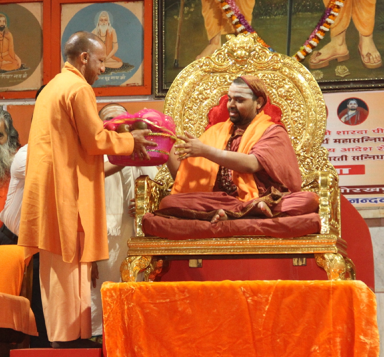 गोरखनाथ मंदिर में जगतगुरु शंकराचार्य श्रीश्री विधुशेखर भारती सन्निधानम की विजय यात्रा के दौरान आयोजित कार्यक्रम में शंकराचार्य को अंगवस्त्र अर्पित करते मुख्यमंत्री योगी आदित्यनाथ। -जागरण