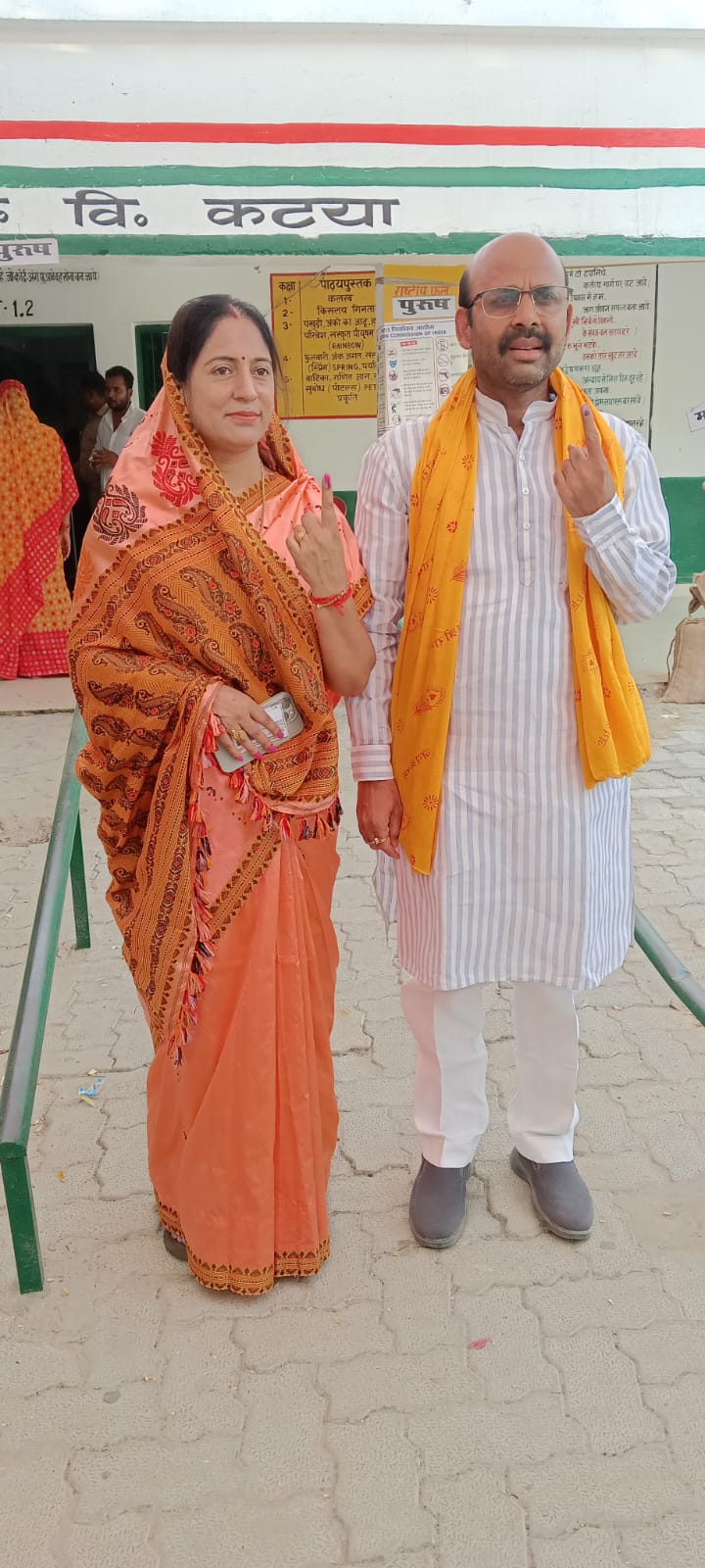 कटया बूथ पर वोट डाल अमिट स्याही का निशान दिखाते भाजपा प्रत्याशी हरीश द्विवेदी और उनकी पत्नी विनीता द्विवेदी।