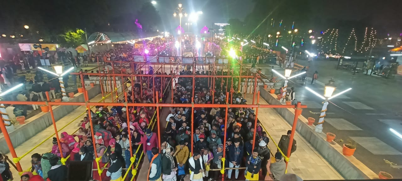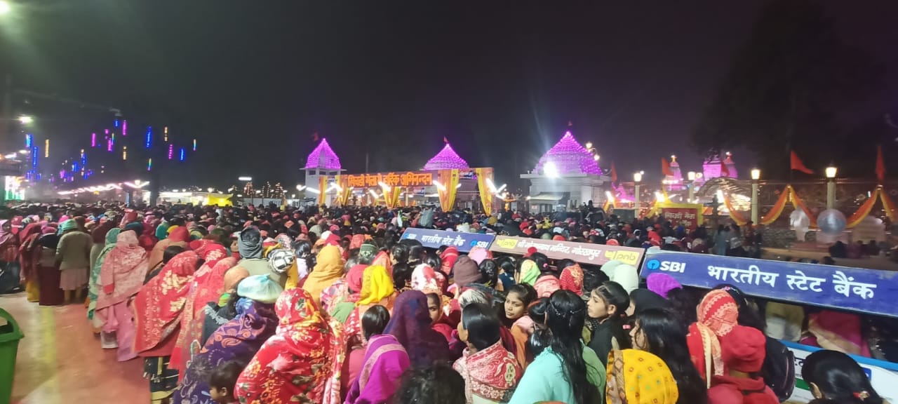 कतारबद्ध होकर बाबा के चरणों में श्रद्धा अर्पित कर रहे श्रद्धालु