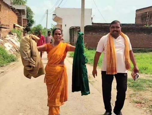 दुल्हन के खेत से मिले कपड़े दिखाती महिला। जागरण