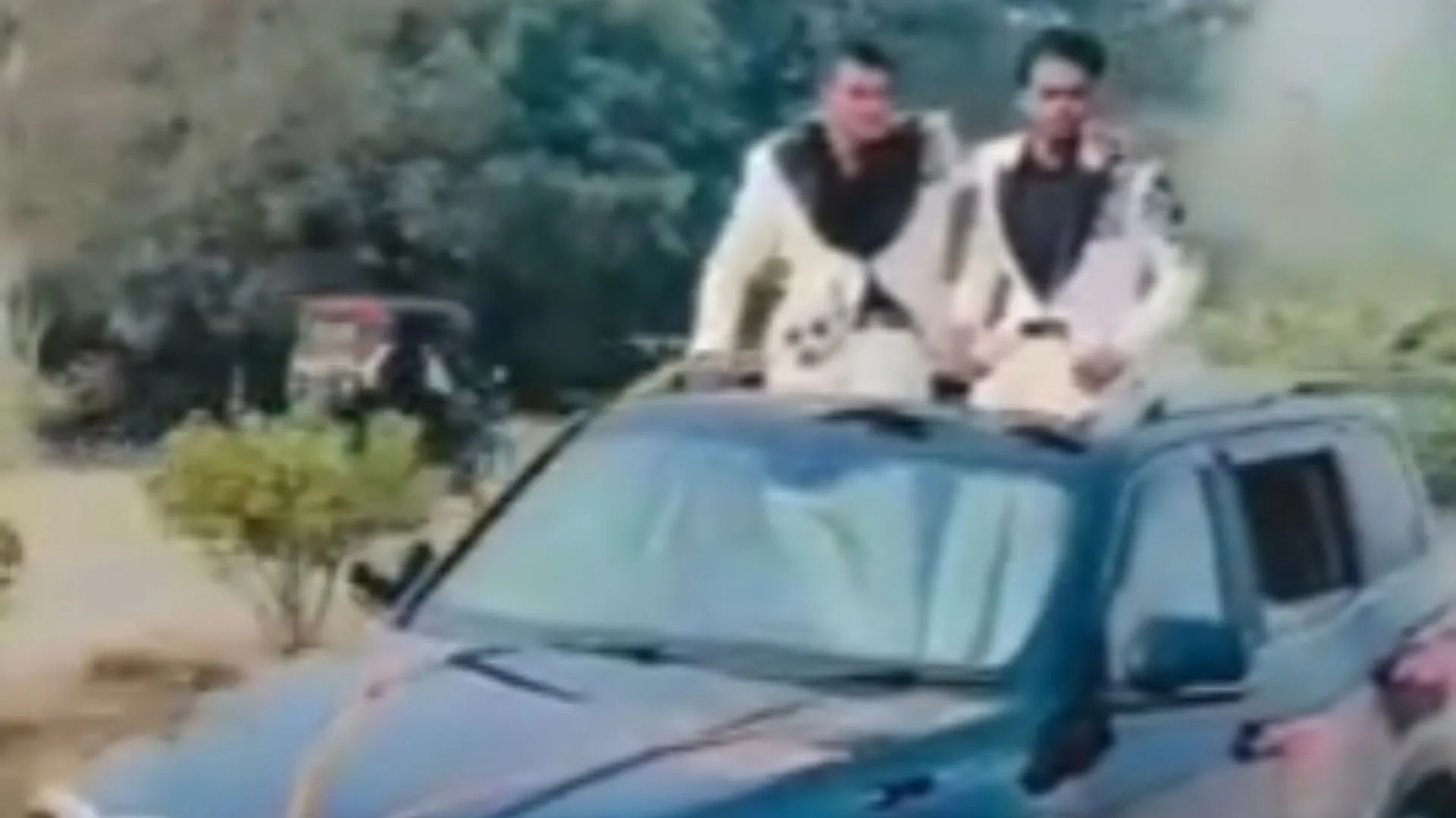 युवक न केवल चलती कार से बाहर लटके हुए हैं, बल्कि एक-दूसरे की ओर इशारे करते हुए वीडियो शूट भी करवा रहे हैं। इस लापरवाही से हाईवे पर चल रहे अन्य वाहनों के चालकों की जान को गंभीर खतरा पैदा हो गया।