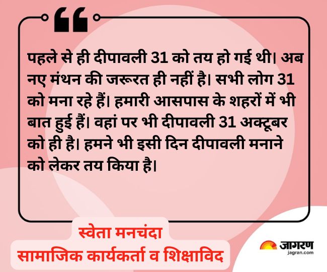 मेरे विचार से दीपावली 31 अक्टूबर को ही मनाई जानी चाहिए और हम भी इसी दिन घर और अपने प्रतिष्ठान पर दीपावली मनाएंगे। एक नवंबर को दीवाली मनाने का कोई औचित्य नहीं है। सभी रिश्तेदारियों और दूसरे शहरों में 31 को दीवाली मनाई जा रही है। - रजत सिंघल, सामाजिक कार्यकर्ता व युवा व्यापारी