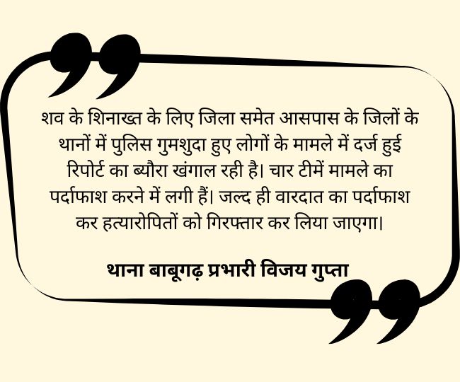 इसके अलावा पुलिस के हाथ अभी तक कोई पुख्ता सबूत नहीं लगा है। थाना बाबूगढ़ प्रभारी विजय गुप्ता ने बताया कि शिनाख्त के लिए जिला समेत आसपास के जिलों के थानों में पुलिस गुमशुदा हुए लोगों के मामले में दर्ज हुई रिपोर्ट का ब्यौरा खंगाल रही है। चार टीमें मामले का पर्दाफाश करने में लगी हैं। जल्द ही वारदात का पर्दाफाश कर हत्यारोपितों को गिरफ्तार कर लिया जाएगा।