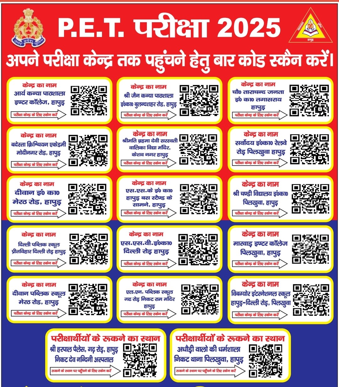 हापुड़ यातायात पुलिस ने पीईटी परीक्षा-2025 के अभ्यर्थियों के लिए अनूठी पहल की है। क्यूआर कोड स्कैन कर गूगल मैप से परीक्षा केंद्र तक आसानी से पहुंचा जा सकेगा। रेलवे स्टेशन बस अड्डे जैसे स्थानों पर क्यूआर कोड लगाए गए हैं जिससे बाहर से आने वाले छात्रों को सुविधा होगी। इससे यातायात प्रबंधन में भी मदद मिलेगी।