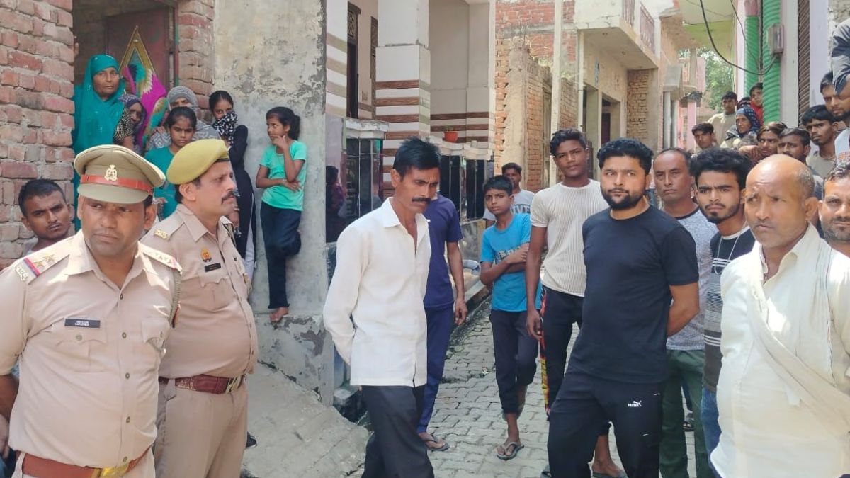 मृतक के घर के बाहर मौजूद पुलिस व लोगों की भीड़। फोटो- जागरण