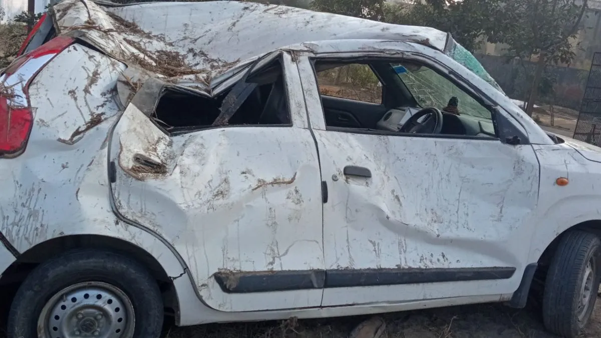 क्षमता से अधिक गन्ने से लदा ट्रैक्टर-ट्राला राह चलते कार के ऊपर पलटा, शीशा तोड़कर कार सवारों ने बचाई जान