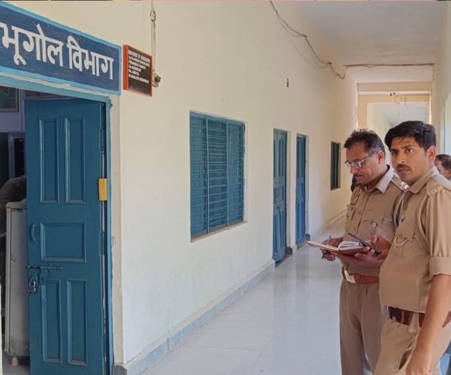पीसी बागला डिग्री कालेज के भूगोल विभाग में जांच के लिए पहुंची पुलिस टीम। जागरण