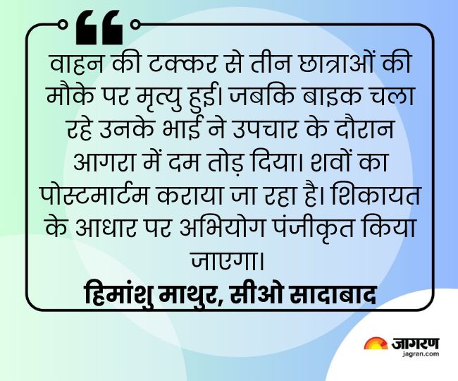 Hathras Accident News Update सादाबाद में सड़क हादसे में तीन छात्राओं और एक युवक की मौत हो गई। दो परिवारों में कोहराम मचा है। नरगिस शहनाज की मौत की खबर से उसकी मां मदीना का बुरा हाल है। रात में बेटे की मौत की खबर सुनकर तो मदीना का मानो कलेजा ही फट गया। चार मौतों से हर कोई बेहाल है।