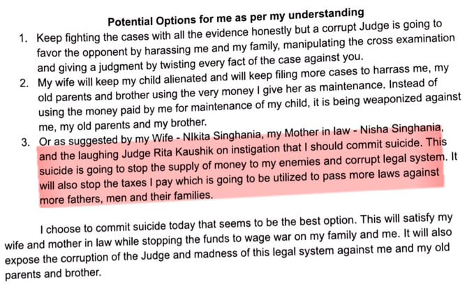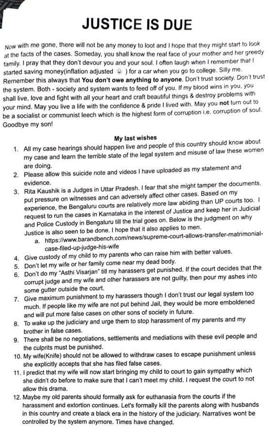 इंजीनियर अतुल ने मौत से पहले अपने सुसाइड करने के कारण, कोर्ट के भ्रष्टाचार, उत्पीड़न व एक्सटार्शन की बातों का उल्लेख करते हुए राष्ट्रपति, प्रधानमंत्री, सुप्रीम कोर्ट को सारी बातें मेल भेजा था। 16 पेज के मेल में उसने लिखा कि जब आप इसे पढ़ रहे होंगे तब मैं मर चुका होऊंगा। इसमें उसने पत्नी सहित कई लोगों का जिक्र किया है।