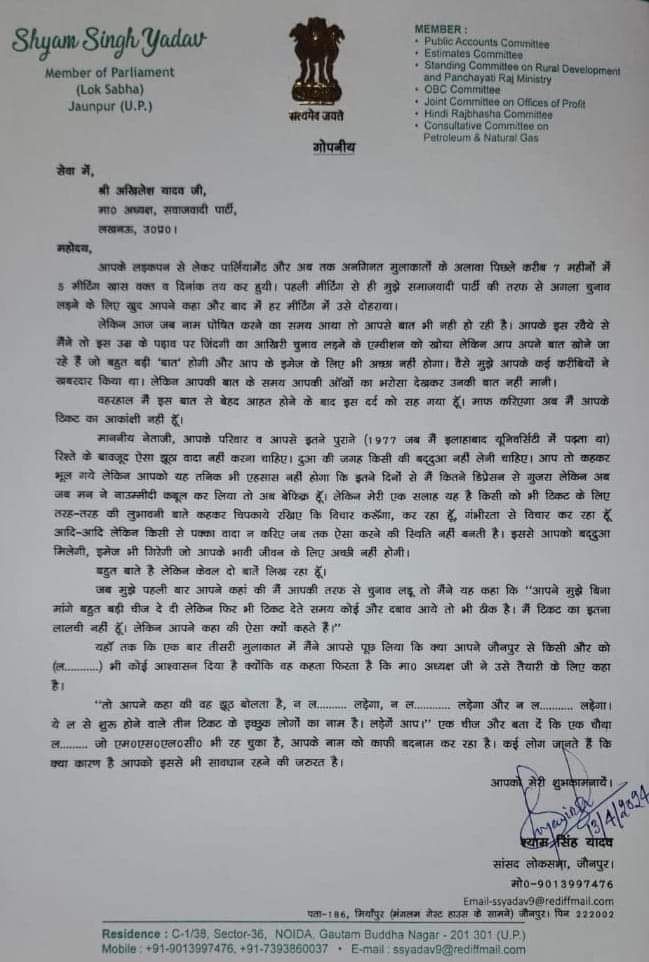 जागरण संवाददाता, जौनपुर। जौनपुर से लोकसभा का टिकट न मिलने पर नाराज सांसद श्याम सिंह यादव ने समाजवादी पार्टी के राष्ट्रीय अध्यक्ष अखिलेश यादव को पत्र लिखा है। उन्होंने सपा सुप्रीमो पर कई गंभीर आरोप लगाए हैं। उनका 13 अप्रैल को लिखा पत्र इंटरनेट मीडिया पर तेजी से प्रसारित हो रहा है।