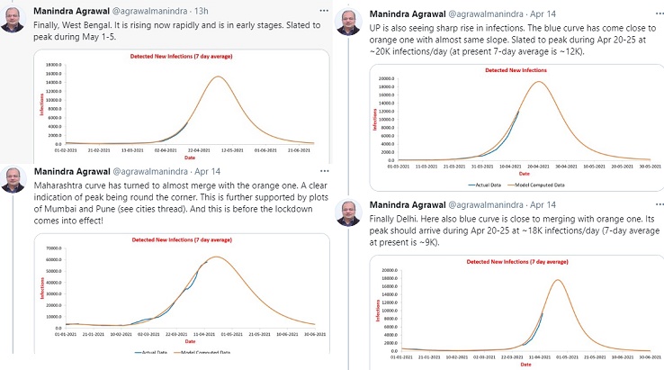 आइआइटी कानपुर के प्रोफोसर मणींद्र अग्रवाल ने देश के जिन राज्याें में कोरोना वायर ज्यादा कहर बरपा रहा है, वहां के केस और वायरस का अध्ययन करते हुए डेट वाइज ग्राफ तैयार किया है। हर राज्य के लिए अगल ग्राफ तैयार करते हुए कोरोना का पीक टाइम और ग्राफ गिरने की संभावित तिथि दर्शाते हुए दावा किया है। उन्होंने राज्यवार ग्राफ अपने ट्वीटर अकाउंट पर भी साझा किए हैं।