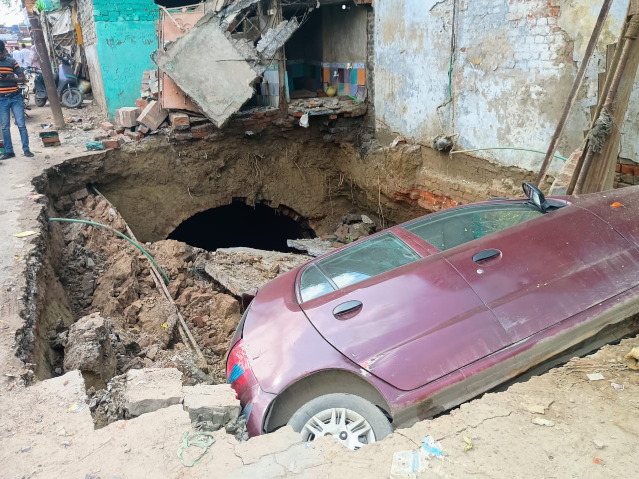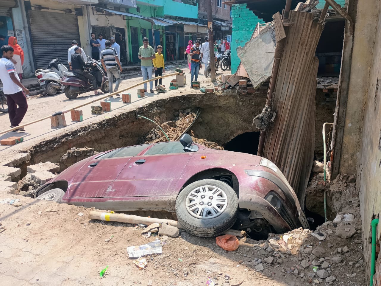 शुक्रवार दोपहर अचानक कूबा मस्जिद के पास करीब 20 फिट लंबा और 10 फिट गहराई में डाट नाला भरभराकर धंस गया। इस दौरान नाले पर खड़ी सरैया निवासी सलीम की कार भी नाले में समा गई।
