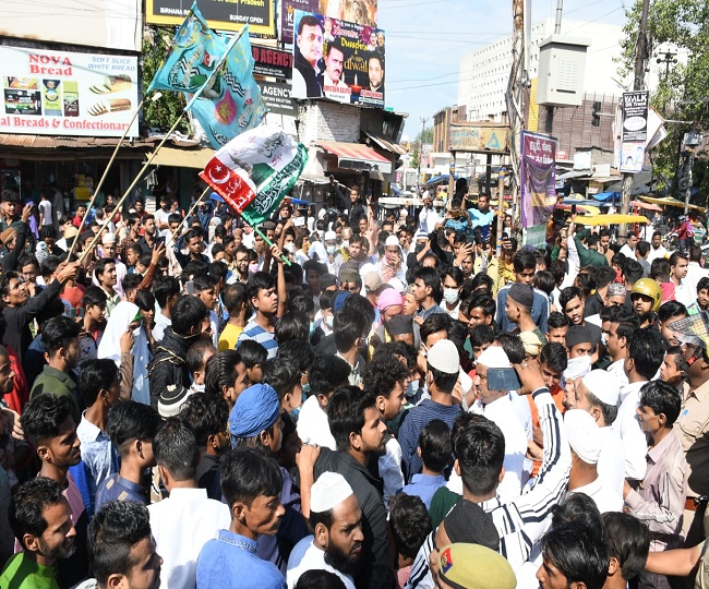 चौकी का घेराव करते हुए जुलूस निकालने की मांग शुरू कर दी। इस पर पुलिस ने धर्म गुरुओं के माध्यम से लोगों को समझाने का प्रयास किया, लेकिन हुजूम जुलूस निकालने की मांग को लेकर अड़ा रहा। भीड़ में मौजूद कुछ लोगों ने परेड की ओर बढ़ने की कोशिश की तो पुलिस कर्मियों ने घेराबंदी करके उन्हें रोका। देखते-देखते भीड़ में लोगों की संख्या बढ़ती चली गई। धर्म गुरुओं के समझाने के बाद भी लोग नहीं माने। परेड की ओर न जाकर हाथों में झंडे लिये नारेबाजी करते हुए वे नई सड़क की ओर बढ़ गए। सड़कों पर भीड़ के चलते नई सड़क पर जाम की स्थिति बन गई। बाद में भीड़ पेच बाग के अंदर मुड़ गई। हालात अब समान्य है। एडीसीपी पूर्वी सोमेंद्र मीणा कई थानों के फोर्स के साथ भीड़ के साथ चलते रहे। उन्होंने बताया कि सब ठीक है। कानून ब्यवस्था का संकट नहीं है।
