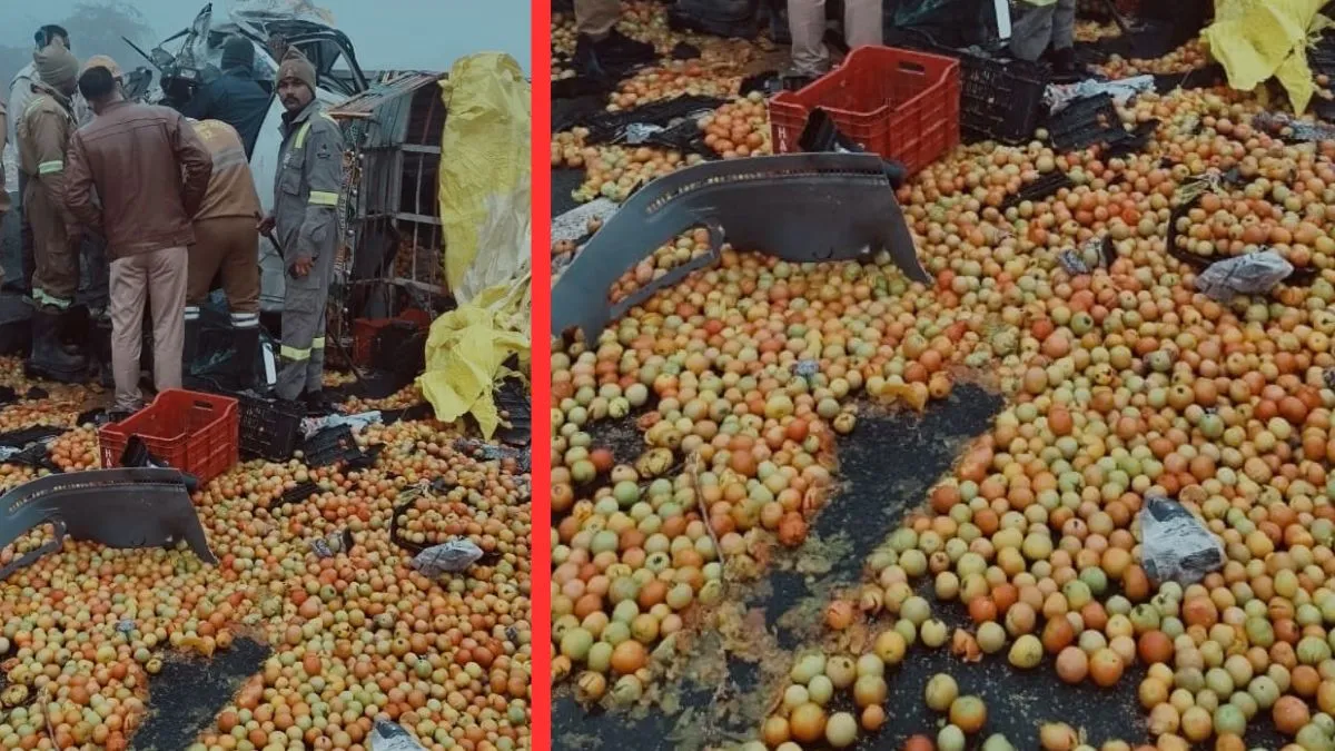 भौंती-रूमा एलीवेटेड हाईवे पर डंपर ने लोडर को मारी टक्कर, बिखरे टमाटर लूटने पर टूट पड़ी भीड़, और फिर...
