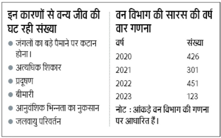 हालांकि वन विभाग के अफसरों का कहना है कि गर्मी के मौसम में सारस दलदली जगह, तालाब या नदी किनारे चले जाते हैं, जिसके कारण उनकी संख्या कम हो जाती है। जिले में वर्ष 2020 तक सारस की संख्या 426 थी लेकिन 2023 में हुई गणना में यह संख्या घटकर 123 पहुंच गई। जून माह में वन विभाग ग्रीष्मकालीन गणना का कार्य शुरू करेगा।