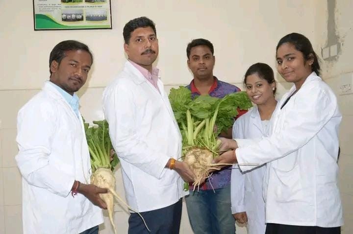 पांच किलो वजनी चुकंदर को प्रयोगशाला में ले जाने से पहले दिखाते हुए शोधार्थी। संस्थान