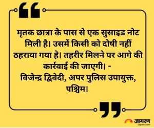 अपर पुलिस उपायुक्त पश्चिम विजेन्द्र द्विवेदी ने बताया कि आत्महत्या का कारण नहीं पता चला है। छात्रा का मोबाइल कब्जे में लेकर जांच की जा रही है। छात्रा ने सुसाइड नोट में किसी को भी दोषी नहीं ठहराया है। स्वजन से तहरीर मिलने पर मुकदमा दर्ज किया जाएगा।