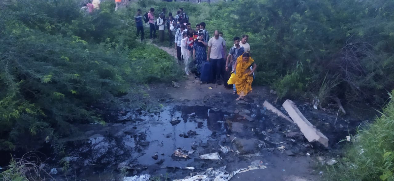 दुर्घटना के बाद औद्योगिक क्षेत्र की ओर नाला पार कर जाते लोग।